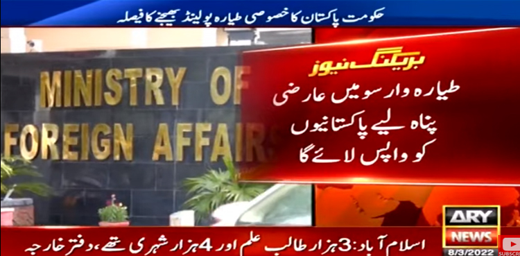 اے آر وائی نیوز کے مطابق حکومت نے خصوصی چارٹرڈ طیارہ پولینڈ بھیجنے کا فیصلہ کیا ہے جس سے وارسو میں عارضی پناہ لیے پاکستانی شہریوں کو واپس لایا جائے گا۔