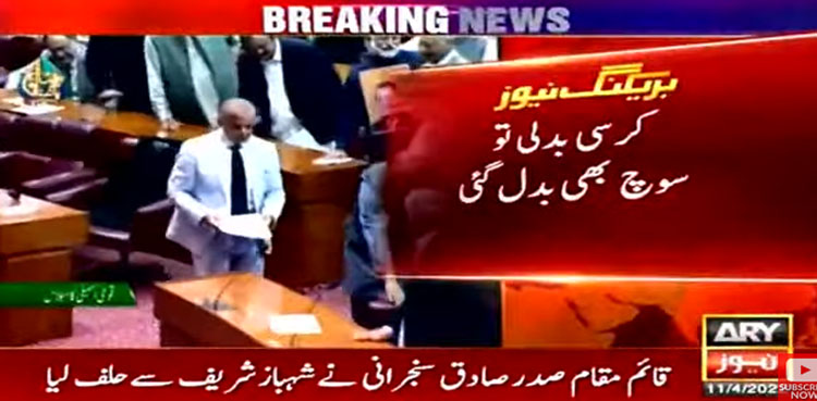 اے آر وائی نیوز کے مطابق مسلم لیگ ن کے صدر شہباز شریف نے وزیراعظم کے عہدے کا حلف چیئرمین سینیٹ اور قائمقام صدر صادق سنجرانی نے لیا۔