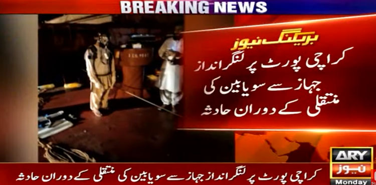 اے آر وآئی نیوز کے مطابق کراچی پورٹ پر لنگر انداز جہاز سے سویابین کی منتقلی کے دوران حادثہ پیش آیا جس کے نتیجے میں 2 مزدور جاں بحق ہوگئے۔