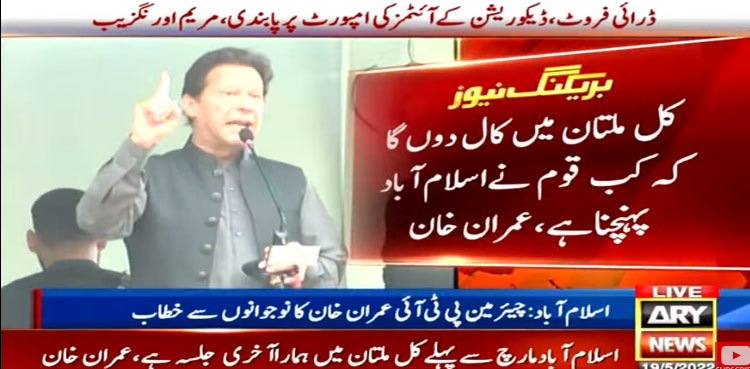 اسلام آباد میں نوجوانوں سے خطاب کرتے ہوئے پی ٹی آئی چیئرمین عمران خان نے کہا کہ برصغیر کی تاریخ کا سب سے بڑا انسانوں کا سمندر آنے والا ہے، اسلام آباد مارچ سے پہلے کل ملتان میں ہمارا آخری جلسہ ہے کل ہی کال دوں گا کہ کب قوم نے اسلام آباد پہنچنا ہے۔