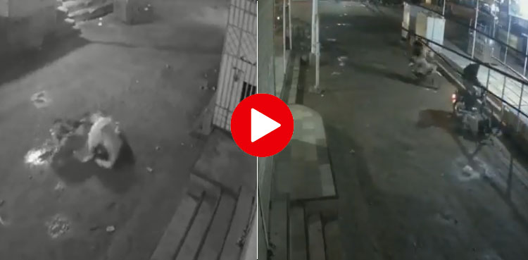 ویڈیو میں دیکھا جاسکتا ہے کہ پولیس نے فوری پوزیشن سبھالتے ہوئے ملزم پر فائرنگ کردی گولی لگتے ہی ملزم چلتی موٹر سائیکل سے گرکر ہلاک ہوگیا۔