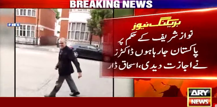 اے آر وائی نیوز کے مطابق مسلم لیگ ن کے رہنما اسحاق ڈار کا کہنا ہے کہ نواز شریف کے حکم پر پاکستان جارہا ہوں ڈاکٹرز نے سفر کی اجازت دے دی ہے۔