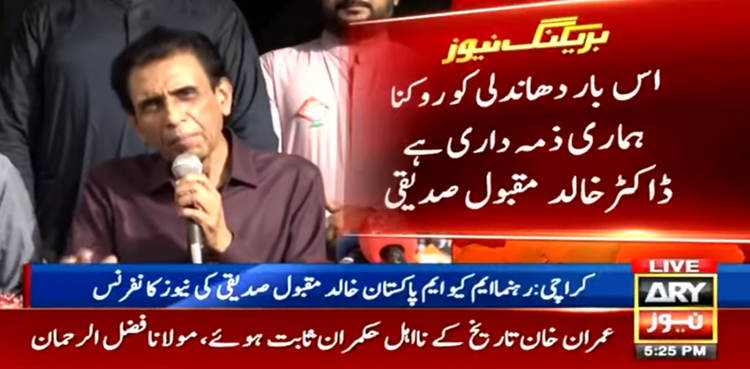 پریس کانفرنس کرتے ہوئے خالد مقبول صدیقی نے کہا: ’2018 کے عام انتخابات کے دوران کراچی کے حلقہ این اے 245 میں دھاندلی ہوئی تھی، اس بار دھاندلی کو روکنا ہماری ذمہ داری ہے‘۔