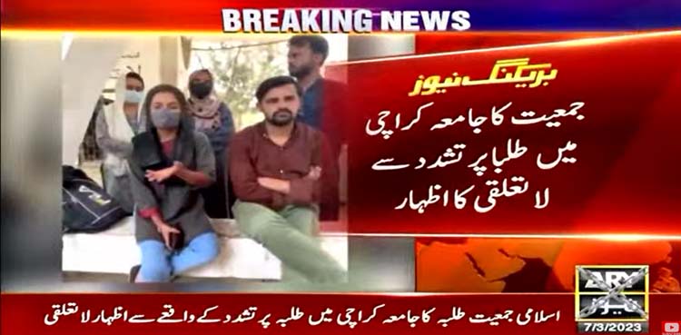 ترجمان اسلامی جمعیت طلبہ جامعہ کراچی نے واقعے سے لاتعلقی کا اعلان کیا اور کہاکہ جامعہ میں طلبہ پر تشدد سے لاتعلقی کا اظہار کرتے ہیں ہم تمام مذاہب کا احترام کرتے ہیں۔