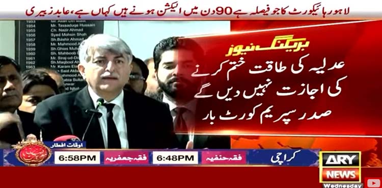 اے آر وائی نیوز کے مطابق صدر سپریم کورٹ بار عابد زبیری نے میڈیا سے گفتگو کرتے ہوئے کہا کہ لاہور ہائیکورٹ کا جو فیصلہ ہے کہ 90 دن میں الیکشن ہونے ہیں وہ کہاں ہے؟ ایک بار تاریخ دے دی گئی تو تاریخ تبدیل کرنے کا الیکشن کمیشن کو کیا اختیار تھا، الیکشن کمیشن کو تاریخ پر اعتراض تھا تو نظرثانی کے لیے درخواست دیتی، اگر فل کورٹ بننا ہے تو 15 ججز کا بنے گا ورنہ نہیں بنے گا۔