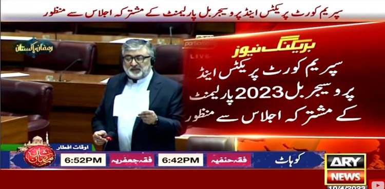 اے آر وائی نیوز کے مطابق اسپیکر قومی اسمبلی راجہ پرویز اشرف کی زیر صدارت ہونے والے پارلیمنٹ کے مشترکہ اجلاس میں وزیر قانون سینیٹر اعظم نذیر تارڑ نے سپریم کورٹ پریکٹس اینڈ پروسیجر بل منظوری کے لیے پیش کیا جسے کثرت رائے سے منظور کرلیا گیا ہے۔