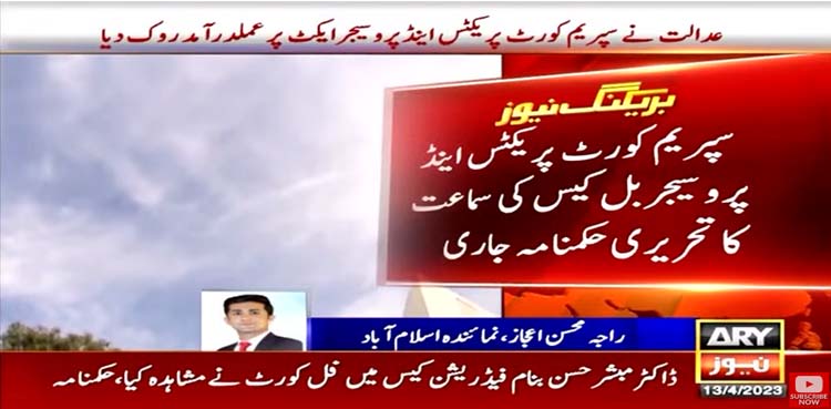 حکم نامے میں کہا گیا ہے کہ ڈاکٹر مبشر حسن بنام فیڈریشن کیس میں فل کورٹ نے مشاہدہ کیا کہ عام طور پر کسی قانون کی دفعات کو معطل نہیں کیا جاسکتا۔