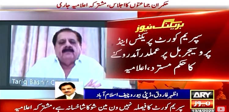 اے آر وائی نیوز کے مطابق حکمران جماعتوں کے اجلاس کا مشترکہ اعلامیہ جاری کیا گیا ہے جس میں سپریم کورٹ پریکٹس اینڈ پروسیجر بل پر عملدرآمد روکنے کا حکم مسترد کیا گیا ہے۔