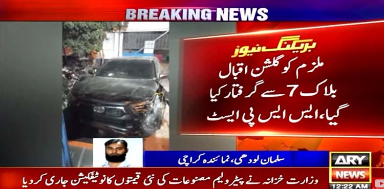 اے آر وائی نیوز کے مطابق ایس ایس پی ایسٹ کا بتانا ہے کہ ملزم کو گلشن اقبال بلاک 7 سے گرفتار کیا گیا، ملزم معاویہ کی گاڑی بھی برآمد کرلی گئی ہے۔