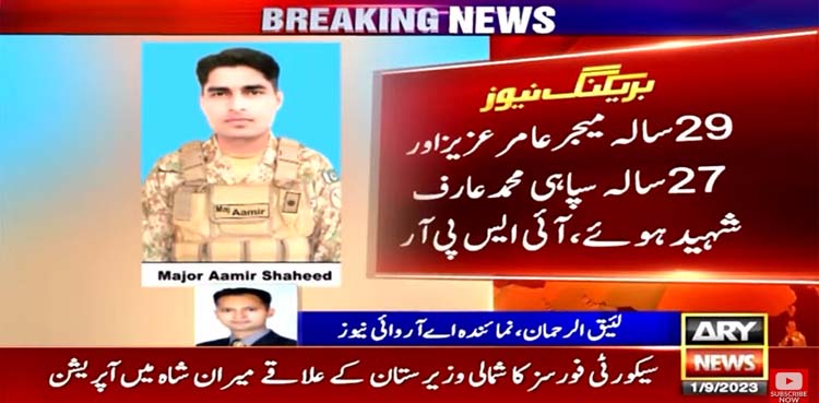 ترجمان پاک فوج کے مطابق دہشت گردوں کی فائرنگ سے 29 سالہ میجر عامر عزیز اور 27 سالہ سپاہی محمد عارف شہید ہوگئے۔