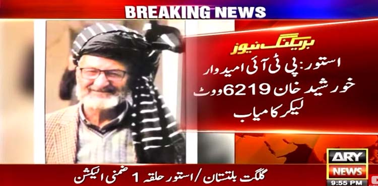 اے آر وائی نیوز کے مطابق استور حلقہ ون کے تمام 56 پولنگ اسٹیشنز کے غیرحتمی غیر سرکاری نتائج کے مطابق پی ٹی آئی امیدوار خورشید خان کامیاب ہوگئے ہیں۔