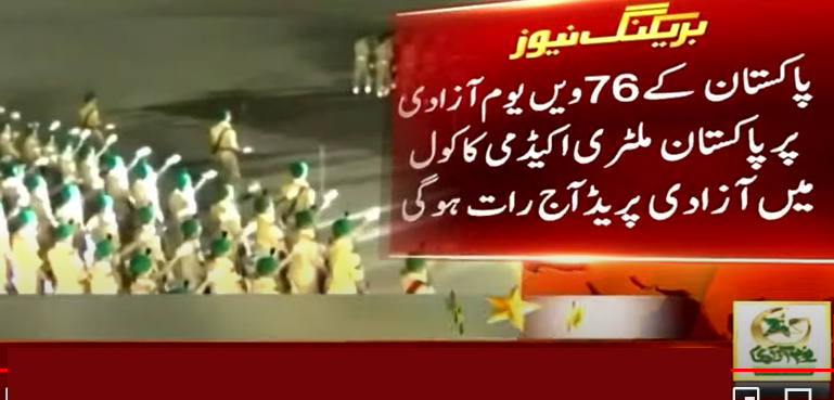 پاکستان کے 76 ویں یوم آزادی کے موقع پر آج پاکستان ملٹری اکیڈمی کاکول میں آزادی پریڈ ہوگی جس کا انعقاد 13 اور 14 اگست کی درمیانی شب کیا جائے گا۔