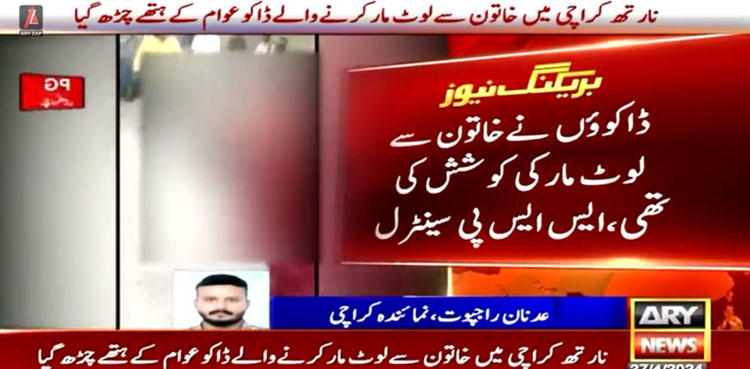 اے آر وائی نیوز کے مطابق کراچی کے علاقے نارتھ کراچی سیکٹر فائیو سی فور میں خاتون سے لوٹ مار کرنے والے ڈاکو عوام کے ہتھے چڑھ گئے۔