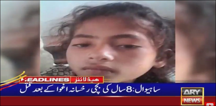 اے آر وائی نیوز کی رپورٹ کے مطابق ساہیوال میں 8 سالہ بچی رخسانہ کو اغوا کے بعد قتل کردیا گیا، اسپتال ذرائع کا کہنا ہے کہ ابتدائی پوسٹ مارٹم رپورٹ میں بچی سے زیادتی کے شواہد ملے ہیں۔