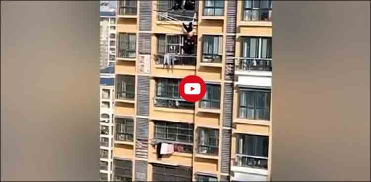 حادثے کی ویڈیو نے سوشل میڈیا پر شیئر ہوتے ہی صارفین کے دل دہلا دئیے، جس میں دیکھا جاسکتا ہے کہ خاتون کا آدھا جسم 18 ویں منزل پر ہے جب کہ اوپری حصّہ 17 ویں منزل پر ہے۔