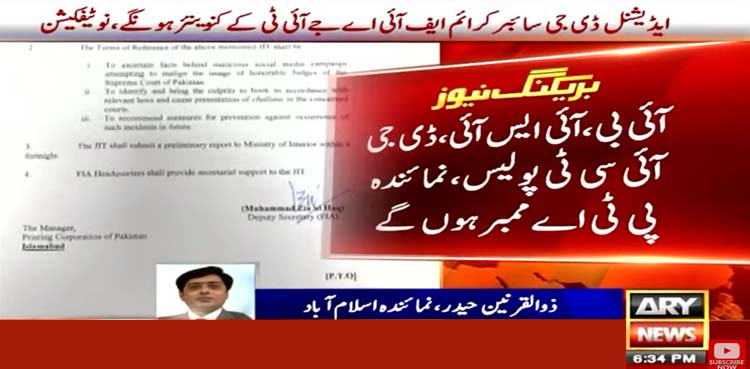 حکومت کی جانب سے جاری نوٹیفکیشن کے مطابق ایڈیشنل ڈی جی سائبر کرائم ایف آئی اے جےآئی ٹی کے کنوینئر ہوں گے جب کہ آئی بی، آئی ایس آئی، ڈی جی آئی سی ٹی پولیس اور نمائندہ پی ٹی اے ممبر ہوں گے۔