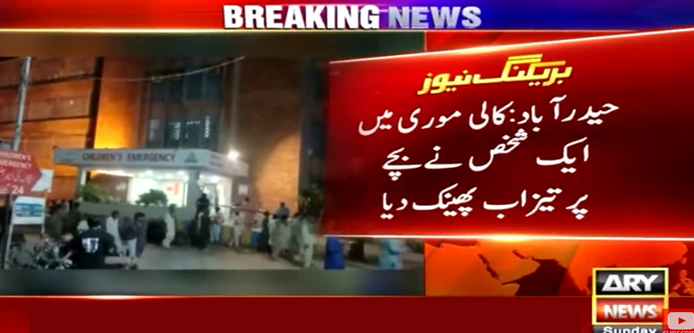 صوبہ سندھ کے شہر حیدرآباد میں تیزاب گردی کا واقعہ پیش آیا ہے جہاں ایک شخص نے 12 سالہ لڑکے پر تیزاب پھینک دیا۔