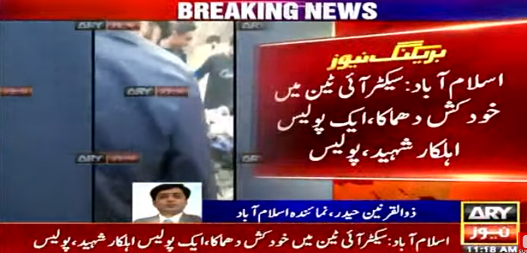 وفاقی دارالحکومت اسلام آباد آئی 10 میں خود کش دھماکا ہوا ہے جس کے نتیجے میں ایک پولیس اہلکار شہید اور 4 اہلکاروں سمیت 6 افراد زخمی ہوئے ہیں۔
