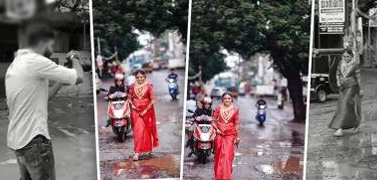 اس مختصر ویڈیو کلپ میں دیکھا جاسکتا ہے کہ سرخ رنگ کی عروسی ساڑھی پہنے دلہن ٹوٹی پھوٹی کھنڈر بنی ایک سڑک سے گزر رہی ہے اس دوران وہ وہاں جمع گندے پانی سے بھی گزرتی ہے اور روڈ سے گزرنے والی گاڑیوں میں بیٹھے افراد یہ انوکھا فوٹو شوٹ دیکھ رہے ہوتے ہیں۔