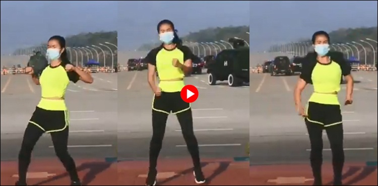 میانمار میں جس وقت فوج اقتدار سنبھالنے کے لیے پارلیمنٹ کی طرف پیش قدمی کررہی تھی، عین اُسی وقت ایک خاتون پارلیمنٹ کے سامنے ورزش (ایروبیکس) میں مصروف تھیں۔