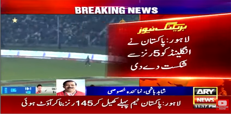 مہمان ٹیم 146 رنز کے ہدف کے تعاقب میں مقررہ 20 اوورز میں 7 وکٹوں کے نقصان پر 139 رنز بناسکی، انگلش کپتان معین علی کی دھواں دھارنصف سنچری بھی ٹیم کو نہ جتواسکی۔