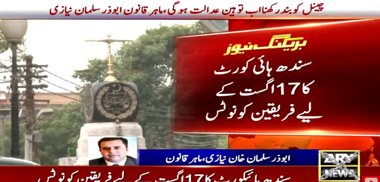 ماہر قانون ابوذر سلمان نے سندھ ہائیکورٹ کی جانب سے اے آر وائی نیوز کا این او سی منسوخی کا نوٹیفکیشن معطل کرنے پر کہا ہے کہ اب چینل بند رکھنا توہین عدالت ہوگی۔
