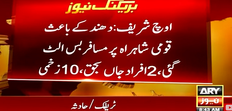 اوچ شریف میں شدید دھند کے باعث مسافر بس الٹ گئی جس کے نتیجے میں 2 افراد موقع پر ہی جاں بحق جب کہ 10 زخمی ہو گئے۔