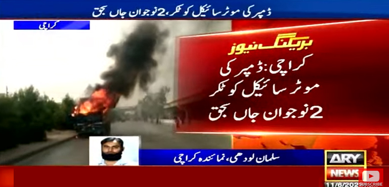 ریسکیو ذرائع نے بتایا کہ حادثے کے نتیجے میں موٹر سائیکل سوار دونوں نوجوان موقع پر ہی دم توڑ گئے حادثے کے فوری بعد ڈمپر ڈرائیور موقع سے فرار ہونے میں کامیاب ہوگیا جب کہ مشتعل اہل علاقہ نے ڈمپر کو آگ لگا دی۔