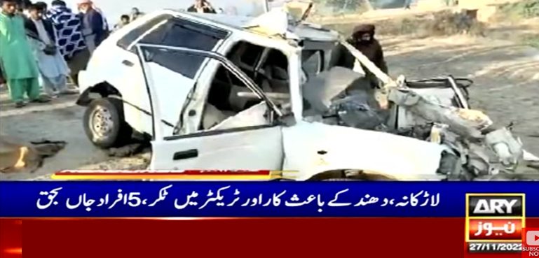 لاڑکانہ میں وگن روڈ پر دھند کے باعث اور کار اور ٹریکٹر میں خوفناک تصادم ہوا جس کے نتیجے میں ایک ہی خاندان کے 5 افراد جاں بحق ہوگئے۔