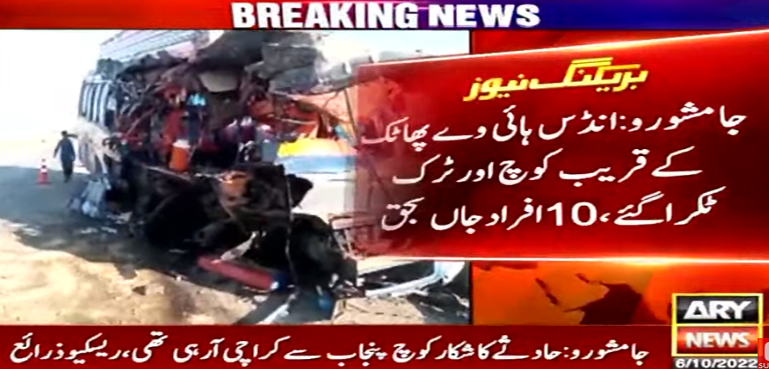 جامشورو میں انڈس ہائی وے تھوڑی پھاٹک کے قریب کوچ اور ٹرک میں تصادم ہوا ہے جس کے نتیجے میں 10 افراد جاں بحق ہوگئے ہیں۔