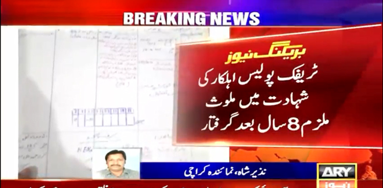 کراچی: سی ٹی ڈی ٹریفک پولیس اہلکار کی شہادت نے کارروائی کرتے ہوئے 8 سال قبل ناظم آباد سگنل پر ٹریفک اہلکار کو نشانہ بنانے والے ملزم کو گرفتار کرلیا۔