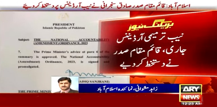 اسلام آباد : وفاقی کابینہ کی جانب سے نیب مجوزہ ترامیم کی منظوری کے بعد قائمقام صدرصادق سنجرانی نے نیب آرڈیننس پر دستخط کردئیے۔