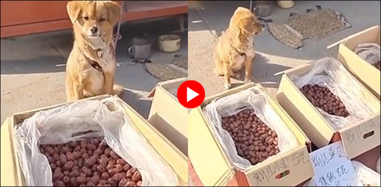 انٹرنیٹ پر وائرل ہونے والی ویڈیو مشرقی چین میں واقع مارکیٹ کی ہے جہاں مصروف ترین شاہراہ پر لگے چھوہارے کے پتھارے پر معصوم کتا دکاندار کی حیثیت سے کھڑا ہوا ہے۔