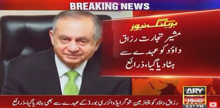 ذرائع کے مطابق وزیراعظم نے مشیر تجارت رزاق داؤد کو عہدے سے ہٹا دیا ہے، رزاق داؤد کو چیئرمین شوگر ایڈوائزری بورڈ کےعہدے سے بھی ہٹایا گیا ہے۔