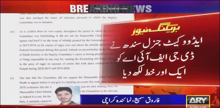 تفصیلات کے مطابق چینی کی ایکسپورٹ اور سبسڈی دینے کے معاملے پر شوگرانکوائری کمیشن کے روبرو وزیراعلیٰ سندھ کی طلبی کے نوٹس پر ایڈووکیٹ جنرل سندھ نے ڈی جی ایف آئی اے کوایک اورخط لکھ دیا۔