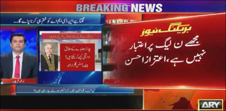 اے آر وائی نیوز کے پروگرام پاور پلے میں میزبان ارشد شریف کے ساتھ گفتگو کرتے ہوئے اعتزاز احسن کا کہنا تھا کہ ’مسلم لیگ ن کا پیپلزپارٹی کے ساتھ چلنے پر اعتبار نہیں کرسکتا، اپنی جماعت کے قائدین کو مشورہ دوں گا کہ وہ مسلم لیگ ن پر بھروسہ نہ کریں‘۔
