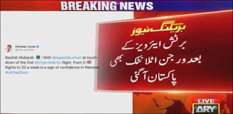 برطانوی ایئرلائن ورجن اٹلانٹک کی ہفتے میں 20 پروازیں پاکستان آئیں گی جبکہ پہلی پرواز پاکستان پہنچ چکی ہے جس کا استقبال وزیر اعظم کے معاون خصوصی زلفی بخاری اور برطانوی ہائی کمشنر کرسچن ٹرنر نے کیا۔