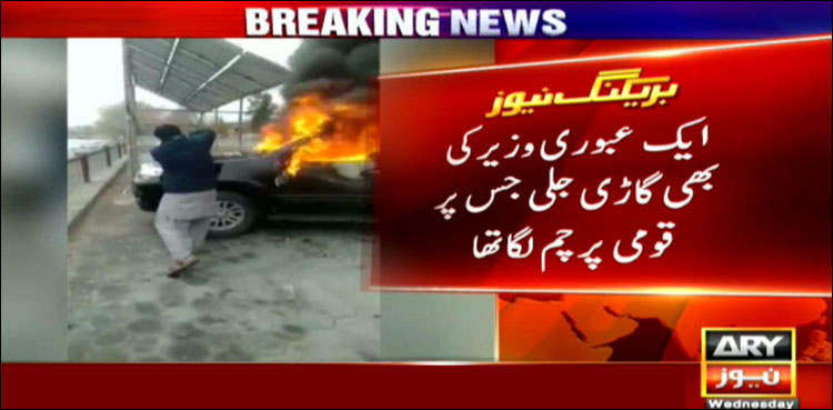 مشتعل مظاہرین نے عبوری حکومت کے وزیر کی سرکاری گاڑی کو بھی آگ لگائی، وزیر کی سرکاری گاڑی پر قومی پرچم لگا ہوا تھا، نوجوان نے جان کی پرواہ کیے بغیر شعلے سے بھڑکتی گاڑی سے قومی پرچم اتار لیا۔