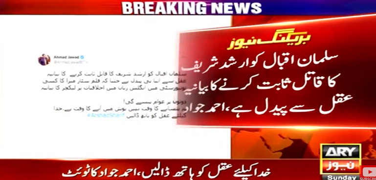 احمد جواد نے اپنے ٹوئٹ میں کہا ہے کہ سلمان اقبال کو ارشد شریف کا قاتل ثابت کرنے کا بیانیہ عقل سے پیدل ہے اور یہ ایسا ہی ہے جیسے فلم اسٹار میرا کا انگلش زبان میں اخلاقیات پر لیکچر کا بیانیہ۔