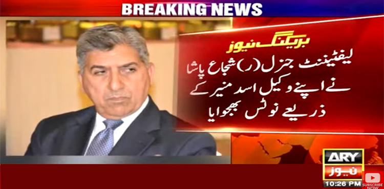 لیفٹیننٹ جنرل (ر) شجاع پاشا نے اپنے وکیل اسدمنیر کےذریعے نوٹس بھجوایا ہے میں کہا گیا ہے کہ آپ کا بیان جھوٹ کا پلندہ ہے آپ نےجھوٹ کاجوپلندہ بُنا اس سےآپ کا جھوٹ واضح ہو گیا جھوٹے الزامات رد کرتے ہیں جو آپ نےمیڈیا کو دیے۔