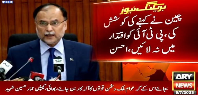 وفاقی وزیر برائے منصوبہ بندی وترقی احسن اقبال نے کہا ہے کہ چین نے گزشتہ اسٹیبلشمنٹ کو کہنے کی کوشش کی تھی کہ پی ٹی آئی کو اقتدار میں لانے کا تجربہ نہ کیا جائے۔