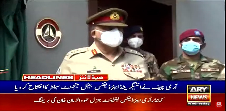 آئی ایس پی آر کے مطابق آرمی چیف نے انٹیگریٹڈ ایئرڈیفنس بیٹل مینجمنٹ سینٹر کا افتتاح کر دیا۔ اس موقع پر ‏کمانڈر آرمی ایئرڈیفنس لیفٹیننٹ جنرل حمودالزمان خان نے ایئرڈیفنس بیٹل مینجمنٹ اور سینٹر کے امور سے ‏متعلق بریفنگ دی۔