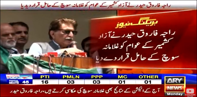 اے آر وائی نیوز کے مطابق وزیراعظم آزادکشمیر اور مسلم لیگ ن کے رہنما راجہ فاروق حیدر نے اپنی ممکنہ شکست کے بعد آزاد کشمیر کے عوام کو غلامانہ سوچ کا حامل قرار دیا۔