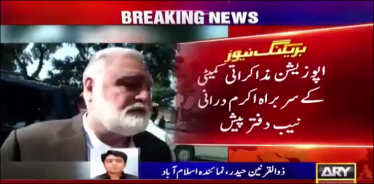 اپوزیشن کی مذاکراتی کمیٹی کے سربراہ اکرم درانی سے تفتیش مکمل کرکے نیب راولپنڈی نے انھیں جانے کی اجازت دے دی اور 12 نومبر کو دوبارہ طلب کرلیا ہے۔