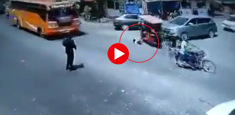 ٹریفک اہلکار کی حاضر دماغی نے رکشے سے گرنے والے بچے کی جان بچالی جس کی ویڈیو سوشل میڈیا پر وائرل ہوگئی۔