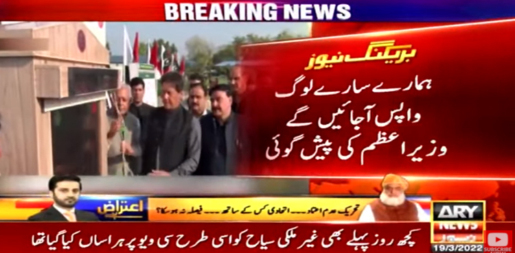 وزیراعظم عمران خان نے کہا ہے کہ جیسے جیسے عدم اعتماد پر ووٹ کا وقت قریب آئیگا پی ٹی آئی سے خفا سب لوگ واپس آجائیں گے۔