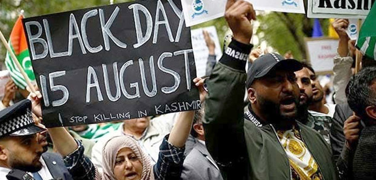 مظاہرین نے کہا کہ کشمیریوں کی آزادی کے غاصب بھارت کو یوم آزادی منانے کا حق نہیں، بھارت دنیا میں جمہوریت کے ماتھے پر بدنما داغ ہے۔