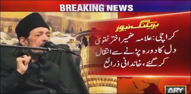 تفصیلات کے مطابق نامور خطیب علامہ ضمیر اختر نقوی چل بسے، خاندانی ذرایع نے بتایا کہ علامہ کو رات گئے دل کا دورہ پڑنے پر اسپتال منتقل کیا گیا تھا جہاں وہ انتقال کرگئے۔