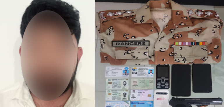 ترجمان رینجرز کے مطابق گرفتار ملزم محمد بلال عرف میجر بلال عرف بھالو خود کو حساس ادارے کا افسر ظاہر کرکے شہریوں سے رقم بٹورتا تھا۔