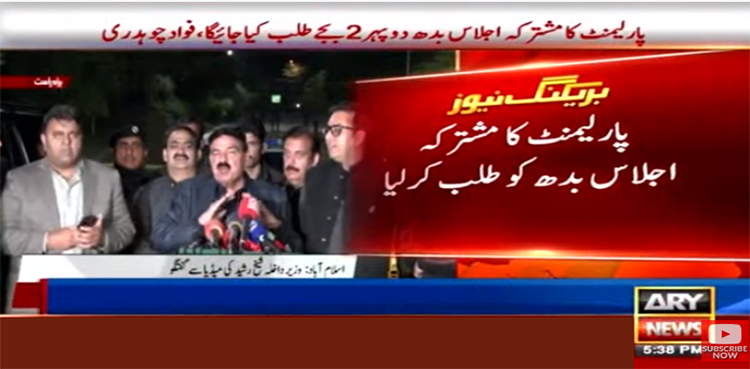 وفاقی وزیرداخلہ شیخ رشید نے گفتگو کرتے ہوئے کہا کہ وزیراعظم عمران خان نےاتحادیوں کےسوالات کےجوابات خود دیئے فیصلہ کیا گیا ہے 8 سے10بل مشترکہ اجلاس میں لائےجائیں گے پارلیمنٹ کامشترکہ اجلاس بدھ کوہوگا۔